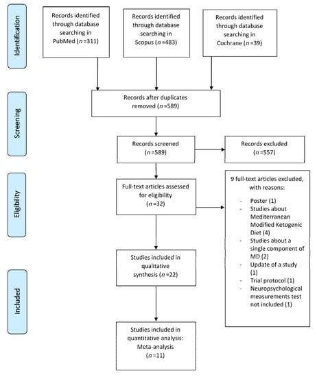 Studies were excluded if they (1) did not include MD; (2) analyzed effects of Modified Mediterranean Ketogenic Diet or individual components of MD; or (3) related other dementias subtypes not AD such vascular dementia, Lewy body and frontotemporal dementias without including outcomes in relation to AD. For quantitative analysis, articles where cognition was not measured objectively by neuropsychological tests, or the diagnosis was based on medical reports were excluded. We also excluded animal studies, letters to editor, editorials, book chapters, no original articles, reviews, trial protocols, and articles that either were not written in English or Spanish