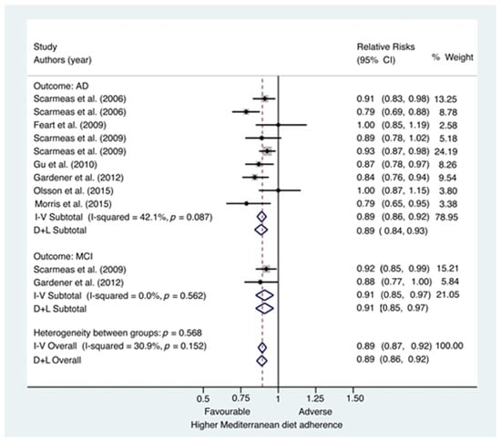 The purpose of this systematic review and meta-analysis was to analyze through scientific evidence if adherence to MD is a beneficial factor to reduce the development of MCI and AD. To this end, 22 articles were qualitatively analyzed, and 11 were included in a meta-analysis. The pooled results showed that a higher adherence to MD significantly reduces the risk of developing MCI and AD.