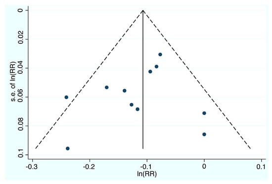 Funnel plot with pseudo 95% confidence limits. RR=relative risk; s.e. = standard error.