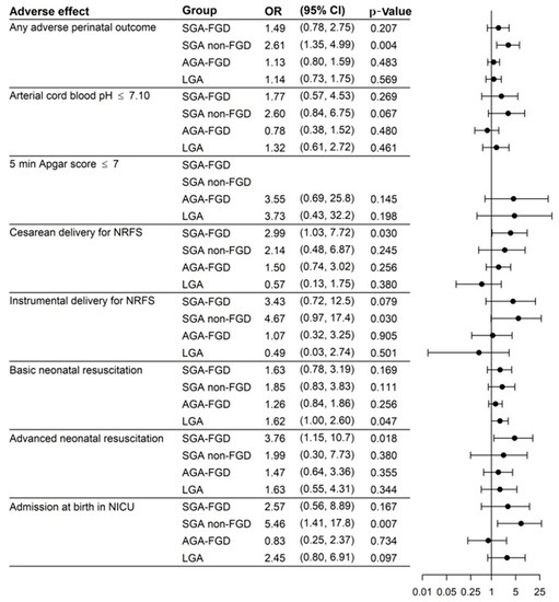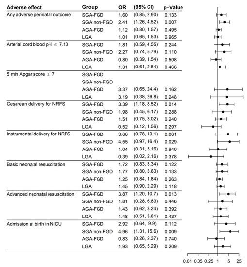 | Adverse Effects | Total | SGA FGD | SGA Non-FGD | AGA FGD | AGA Non-FGD | LGA | p-Value |
