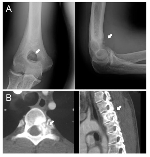(A) Twenty-two-year-old male patient affected by stage 2 distal humerus OBL (white arrows): the lesion was considered suitable for intralesional surgery; (B) twenty-one-year-old male patient affected by a D3 left pedicle OBL (white arrows): wide resection was performed to decrease the risk of local recurrence.