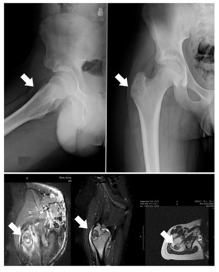 Case 3, a male patient with OBL of the right trochanter; on the upper image, the X-ray shows a quite well-defined osteolytic lesion (white arrows); on the lower image, the related MRI highlights the important oedema surrounding the OBL. The indication for surgery was based on the risk of a fracture due to both eventual RF thermoablation and the action of pelvic-trochanteric muscles.