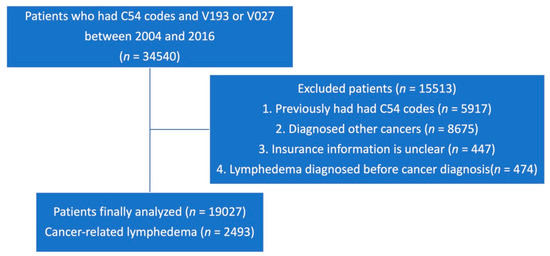 To select the study group, we used the 10th revision of the International Statistical Classification of Diseases and Related Health Problems (ICD-10), the Health Insurance Medical Care Expenses (2017 and 2018 versions), and the HIRA Drug Ingredients Codes for diagnostic codes, surgery codes, and prescription codes. The study population, lymphedema patients who were diagnosed after endometrial cancer treatment, was defined as patients who had diagnostic codes for both endometrial cancer (ICD-10 code C54) and lymphedema (ICD-10 code I890) between 2004 to 2017. Among them, those who already had a lymphedema diagnosis prior to the first endometrial cancer diagnosis were excluded. Patients diagnosed with endometrial cancer from 2004 to 2005 were excluded for the wash-out period, so only newly diagnosed endometrial cancer patients were included (Figure 1).