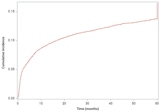 From January 2004 to December 2017, a total of 19,027 endometrial cancer patients were included, of which 2493 (13.1%) developed lymphedema (Figure 2). Table 1 shows the incidence of lymphedema in endometrial cancer according to the basal characteristics and treatment modality of the study group. About 88% of patients were diagnosed with endometrial cancer over the age of 40, and the incidence of endometrial cancer was the highest in the upper-quartile income group at 32.2%. Regarding residential area and treatment modality, 67.9% of people lived in urban areas, and about 95% of people were treated with surgery alone or a combination of surgery and other treatment modalities.