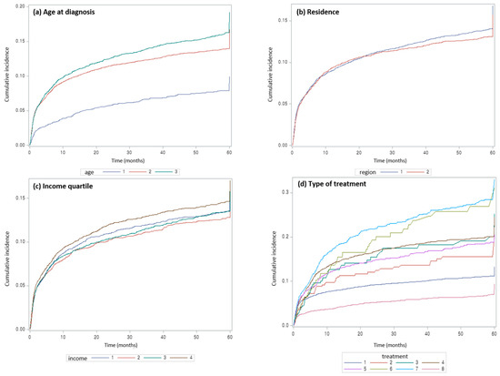 Cumulative incidence of lymphedema according to age at diagnosis, residence, income quartile, and endometrial cancer treatment modality. (a). Cumulative incidence of lymphedema according to age. (1; 0–39 years, 2; 40–59 years, 3; 60+ years old) (b). Cumulative incidence of lymphedema according to residence. (1; urban, 2; rural) (c). Cumulative incidence of lymphedema according to income. (1; lowest income, 2; lower, 3; upper, 4; highest) (d). Cumulative incidence of lymphedema according to treatment modalities. (1; Surgery, 2; Radiation, 3; Chemotherapy, 4; S + R, 5; S + C, 6; R + C, 7; S + R + C, 8; other).