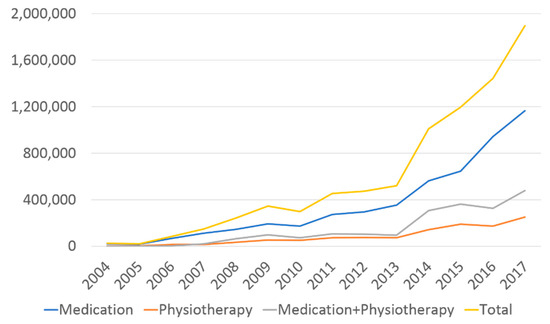 According to the data from the National Health Insurance Service, the medical and physical therapy costs for lymphedema treatment in Korea from 2004 to 2017 are shown in Table 2. The total treatment cost for lymphedema increased from 26,039 USD in 2004 to 1,894,505 USD in 2017. The total cumulative treatment cost exceeded 8,155,093 USD in 2017 (Figure 4), and the cost of each treatment modality was also trending upwards. Among them, the cost of administering medical or physical therapy alone in 2017 had increased 56- and 57-fold, respectively, compared to 2004, while the cost for administering these two treatment regimens together increased about 500-fold.