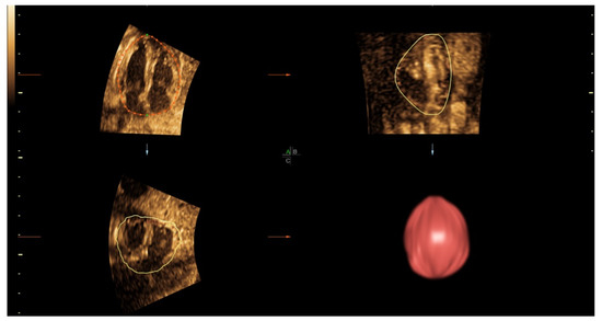 An example of cardiac volume measurement at 20 weeks of gestation, using VOCAL techniques, with rendering to show the volume of 10.52 mL (A/B/C is the name of each panel in multiplanar view).