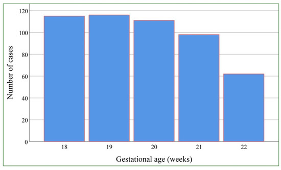 During the period of recruitment (2012–2020), a total of 554 pregnancies at risk of fetal Hb Bart’s disease underwent fetal echocardiography with successful volume dataset acquisition. Of them, 32 were excluded because of poor quality volume datasets, 20 cases were excluded because the volume datasets did not include the whole heart, and the remaining 502 sets meeting the inclusion criteria were available for analysis, consisting of 117 (23.3%) affected fetuses (Hb Bart’s disease) and 385 (76.7%) unaffected fetuses (non-Hb Bart’s disease). All pregnant women with an affected fetus decided to terminate the pregnancy. Note that cordocentesis was performed in all cases, although the possibility of an earlier chorionic biopsy is a clinically available option and that there are preliminary data on non-invasive DNA, potentially to be implemented in the future. The demographic data of the pregnant women are presented in Table 1. Nearly all of the women (97.6%) were of Thai nationality. The mean (±SD) maternal age was 28.7 ± 6.1 years. The mean (±SD) gestational age at the time of ultrasound examination was 19.7 ± 1.3 weeks. The distribution of gestational age at the time of ultrasound diagnosis is presented in Figure 2.