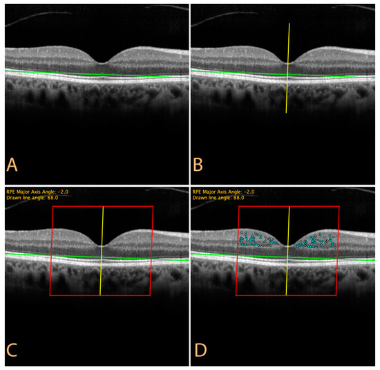 OCT image processing by ImageJ script (available as Supplementary Materials); (A) Identification of the retinal pigment epithelium major axis; (B) A line passing through the center of the fovea is drawn (reference line), according to the angle suggested by the script: (C) Two lines are automatically superimposed, 1500 µm apart of the reference line, temporally and nasally, defining a region of interest (ROI); (D) Hyper-reflective retinal spots are counted by the investigator inside the newly defined ROI.