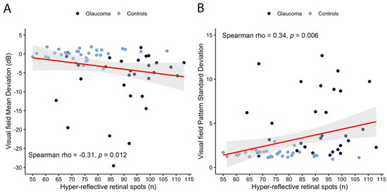Scatterplot of hyper-reflective retinal spot number vs. visual field mean deviation (MD, (A)) and pattern standard deviation (PSD, (B)). Spearman’s rank correlation test.