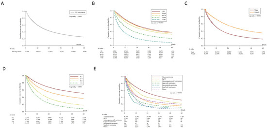Kaplan-Meier overall survival. (A) Kaplan-Meier survival curves for 71,334 patients with lung cancer. (B) Kaplan-Meier survival curves stratified by age (p < 0.0001). (C) Kaplan-Meier survival curves stratified by sex (p < 0.0001). (D) Kaplan-Meier survival curves stratified by Charlson comorbidity index score (p < 0.0001). (E) Kaplan-Meier survival curves stratified by histologic cell type (p < 0.0001).