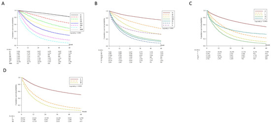 The clinical staging was distributed as follows: stage IA (9208, 12.9%), stage IB (4087, 5.7%), stage IIA (1702, 2.4%), stage IIB (1454, 2.0%), stage IIIA (5309, 7.4%), stage IIIB (6316, 8.9%), stage IV (41,458, 58.1%). Significant differences in survival were noted between neighboring stages (Figure 2A). The survival curve was also assessed based on the clinical T (Figure 2B), clinical N (Figure 2C) and clinical M (Figure 2D) stages, respectively.