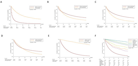 Kaplan-Meier overall survival. (A) Kaplan-Meier survival curves according to with or without any treatment (p < 0.0001). (B) Kaplan-Meier survival curves according to with or without chemotherapy (p < 0.0001). (C) Kaplan-Meier survival curves according to with or without radiotherapy (p < 0.0001). (D) Kaplan-Meier survival curves according to with or without target therapy (p < 0.0001). (E) Kaplan-Meier survival curves according to with or without surgery (p < 0.0001). (F) Kaplan-Meier survival curves stratified by surgical method (p < 0.0001).