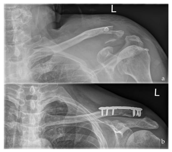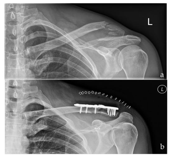 - Fleming, M.A.; Dachs, R.; Maqungo, S.; du Plessis, J.-P.; Vrettos, B.C.; Roche, S.J.L. Angular stable fixation of displaced distal-third clavicle fractures with superior precontoured locking plates. J. Shoulder Elbow Surg. 2015, 24, 700–704. [Google Scholar] [CrossRef]