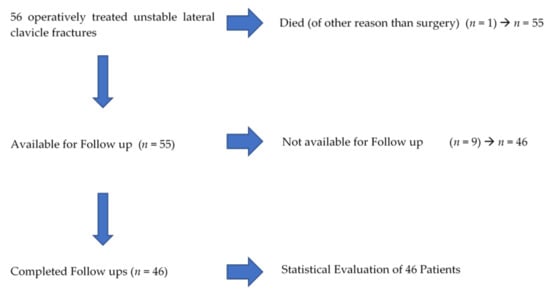 Between 2014 and 2018, 56 isolated lateral clavicle fractures were operated in our institution. 46 (82.1%, 34 male, 12 female) patients with a mean age of 45.0 ± 13.9 years (18.7–80.8) participated in all follow-up examinations (Figure 3). The mean follow up was 39.5 ± 17.8 (14–71.6) months. 29 patients (63%, Group 1) were treated using the knotted DogBone™ technique, 17 with the knotless technique (37%, Group 2). A total of 18 (39.1%) fractures occurred on the right-hand side, whereas 28 (60.9%) occurred on the left. Fractures were classified as 2 type I, 17 type IIa, 26 type IIb and 1 type III lateral clavicle fractures according to Neer [3,16]. All fractures healed in the follow-up period without re-fractures, mal- or non-union.