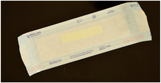 In study group B, a sterile calcium–sodium alginate drain, Kaltostat (ConvaTec Polska Sp. z o.o., Warsaw, Poland), was sutured into the atrial floor, in the region of the releasing incision, below the last knot suture (Figure 3 and Figure 4). It is a soft, nontextile, compressed white dressing recommended by the manufacturer for use after dental extractions among other things. It absorbs wound exudate, slowly turning into a gel–fibrous matrix that, by maintaining moisture and an optimal environment, does not act as a reservoir for bacteria and promotes tissue healing. In addition, it contains calcium ions, which help to accelerate the blood clotting process. The drain size was also adjusted to the extent of the operated area—factory thickness 1 mm, width 1.5–2 cm, length 5.5 cm. The drain was sewn with the same technique and in the same way as the latex drain (Figure 5). After 24 h, at the follow-up visit, it was removed from the wound.