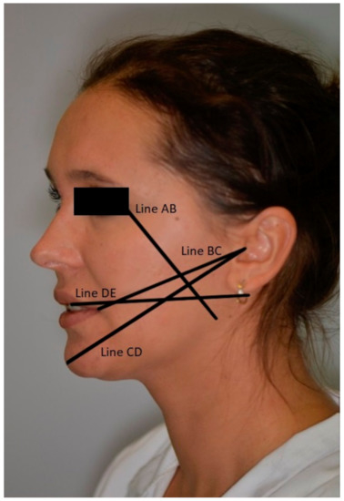 - The distance between tragus (Tragus—T) and the angle of the mouth (Chelion—Ch)—line BC;