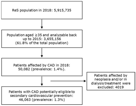 For more than five million inhabitants that were analyzable through the ReS database in 2018, 46,063 patients aged ≥ 35 (1.3%) were found to be affected by CAD and suitable for long-term secondary CV prevention treatments, according to the selection criteria described in the Section 2 (Figure 1).