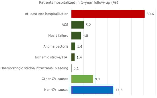 The risk of recurrent admissions at one year after a CV event, especially for MI and stroke, has been found to be high, specifically for patients who did not follow guideline-recommended therapies [3,11]. The persistent risk of CV diseases in patients with chronic CAD has been shown by different studies [3], which, for example, have found that a one-year incidence of major adverse CV events (i.e., stroke, MI, and CV death) was 4.5% to 20.7% for the overall CAD population [3,20]. Our study shows that the rate of patients hospitalized during the one-year follow-up due to relevant CV events (i.e., ACS-included MI, heart failure, angina pectoris, ischemic stroke/TIA, and haemorrhagic stroke/intracranial bleeding) was 11.4%, which is a not negligible rate. A high proportion of subjects was hospitalized due to a new CAD diagnosis (5.2% of subjects with ACS), with 1.4% due to ischemic stroke/TIA. Interestingly, these findings are consistent with the results of a French claims database analysis, which provided that, during the one year following a first hospitalization for MI, 3.1% of individuals experienced a new MI and 1.9% experienced stroke/TIA [20]. All these data reflect an unsatisfactory risk factor control and a high rate of new atherothrombotic events in patients with prior CAD.