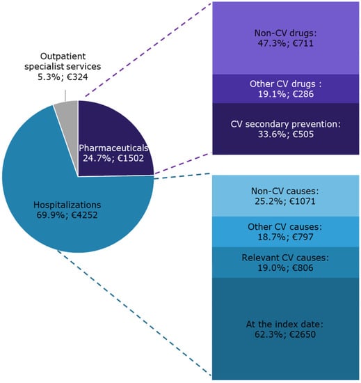 The overall expenditure originated from the integration of all the health care charged to the INHS. Hospitalizations accounted for 69.9% of the overall expenditure. A substantial contribution was provided by non-CV causes (25.2% of the hospitalization expenditure). Pharmaceuticals accounted for 24.7% of the overall cost. Concomitant non-CV drugs, which also accounted for 11.7% of the overall expenditure per capita, determined approximately half of pharmaceutical costs.