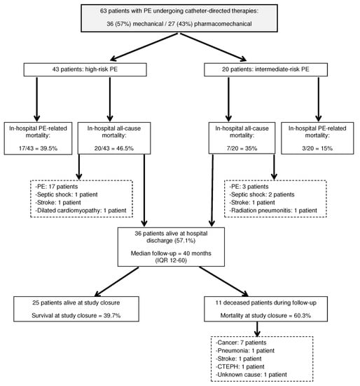 The primary objective was to assess in-hospital PE-related mortality and its predictive factors in a series of patients with acute PE undergoing CDT. Secondary objectives were to assess all-cause in-hospital mortality and long-term outcomes.