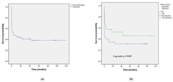 (a) Kaplan–Meier survival estimates from the time of endovascular reperfusion therapy for the whole group of 63 patients with pulmonary embolism (20-month, 40-month and 100-month survival estimates were 0.42, 0.40 and 0.38, respectively); (b) Kaplan–Meier survival estimates from the time of endovascular reperfusion therapy stratified by inferior vena cava filter insertion.