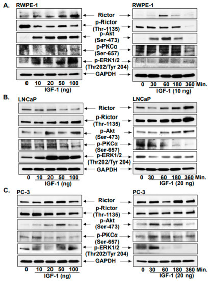 Growth factor (IGF-1) induced Rictor signaling cascade. Asynchronous (A) RWPE-1 normal prostate epithelial cells, (B) LNCaP (androgen sensitive), and (C) PC-3 (androgen refractory) cells were treated with IGF-1 in increasing concentrations (10, 20, 50, 100 ng) and time (30, 60, 180, 360 min) exposure, and later subjected to total cell lysate and western blot analysis. Protein resolved in SDS page gels were Rictor, p-Rictor (Thr-1135), p-AKT (Ser-476), p-PKCα (Ser-657), and p-ERK1/2 (Thr202/Tyr 204). Lanes mentioned as ‘0’ are PBS control-treated cells. For protein, control blots were stripped and reprobed with GAPDH.