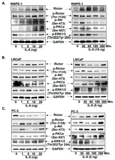 Pro-inflammatory cytokine IL-6 induced Rictor signaling cascade. Asynchronous (A) RWPE-1 normal prostate epithelial cells, (B) LNCaP (androgen sensitive), and (C) PC-3 (androgen refractory) cells were treated with IL-6 in increasing doses (1, 5, 10, 20 ng) and time (30, 60, 180, 360 min) exposure, and later subjected to total cell lysate and western blot analysis. Protein resolved in SDS page gels were Rictor, p-Rictor (Thr-1135), p-AKT (Ser-476), p-PKCα (Ser-657), and p-ERK1/2 (Thr202/Tyr 204). Lanes mentioned as ‘0’ are PBS control-treated cells. For protein, control blots were stripped and reprobed with GAPDH.