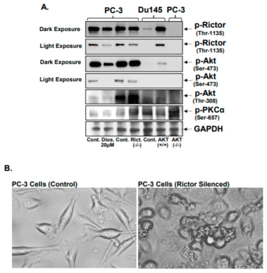 Diosmetin was found to be effective in inhibiting the phosphorylation of both AKT (at Ser-473 and Thr-308) and PKCα (Ser-657; Figure 3A) in PC-3 cells. This suggests that diosmetin has a broad spectrum effect in modulating AKT and PKCα activation in prostate cancer cells. In PC-3 cells where Rictor expression was knocked down, the shape of the cells changed, and became more spherical and smaller in size (Figure 3B). Previous reports also reported that conditional Rictor knockout mice exhibited altered cellular morphology and a reduction in cell size [25].