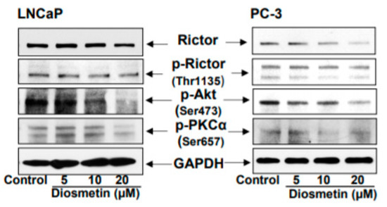 The next objective in the present study was to assess the effect of different doses of diosmetin on the Rictor signaling cascade in LNCaP and PC-3 cells. These two cell lines were treated with varying concentrations of diosmetin (5, 10, and 20 μM) for 24 h. The levels of Rictor expression, Rictor phosphorylation at Thr-1135, p-AKT (Ser-473) and p-PKCα (Ser-657) were all found to be decreased in a dose-dependent manner. No significant changes could be observed in Rictor expression in LNCaP cells, although at the higher dose of 20 μM, decreased Rictor expression was observed (Figure 4). These findings suggest that diosmetin has the potential to modulate the Rictor-induced phosphorylation of AKT and PKCα.