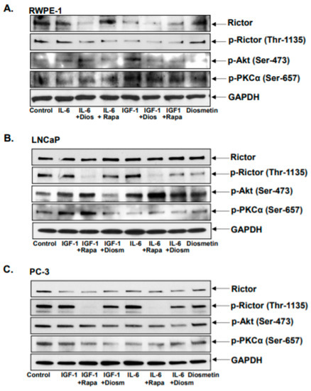 The growth factor IGF-1 and the cytokine IL-6 both exerted significant effects on Rictor as aforementioned. Therefore, the role of diosmetin on IGF-1- and IL-6-induced Rictor signaling activation was next assessed. RWPE1 cells were pre-treated with 10 ng IGF-1 and 10 ng IL-6, whilst LNCaP and PC-3 cells were treated with 20 ng IGF-1 and 5 ng IL-6 for 1 h. After the 1 h treatment, diosmetin treatment was administered (10 μM for RWPE1 cells; and 20 μM for LNCaP and PC-3 cells) for 24 h. The culture media that was used was charcoal-stripped and devoid of any growth factors. The effects mediated by IGF-1 and IL-6 pre-treatment were found to be attenuated by subsequent treatment with diosmetin. The expression of Rictor, phosphorylation of Rictor (Thr-1135), AKT (Ser-473) and PKCα (Ser-657) were all increased after IGF-1 and IL-6 treatment in both prostate cancer cell lines (Figure 5B,C) and in RWPE1 cells (Figure 5A). By contrast, post-treatment with diosmetin significantly reduced the levels of Rictor expression, Rictor (Thr-1135), AKT (Ser-473) and PKCα (Ser-657) phosphorylation in all cell lines tested. Rapamycin, which is an inhibitor of mTOR, was unable to suppress Rictor expression or reduce AKT (Ser-473) and PKCα (Ser-657) phosphorylation, although it could inhibit Rictor (Thr-1135) phosphorylation. Additionally, combining rapamycin with IGF-1 and IL-6 treatment almost completely inhibited Rictor (Thr-1135) phosphorylation. By contrast, the inhibitory effects of diosmetin on the inhibition of Rictor (Thr-1135) were found to be moderate. A previous report suggested that the phosphorylation state of Rictor within the mTORC2 complex, specifically at the Thr-1135 residue, could be considered to be an indirect activity marker of this kinase complex [26]. These findings suggest that diosmetin has the potential to reverse the increased expression of Rictor and increased phosphorylation of AKT (Ser-473) and PKCα (Ser-657) after IGF-1 and IL-6 treatment. In addition, diosmetin may serve to be an effective agent for targeting the Rictor cascade to inhibit prostate cancer progression.
