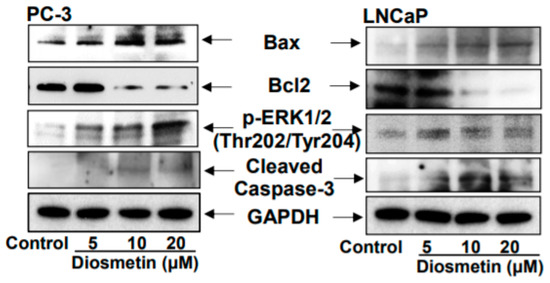 Diosmetin dose response effect on BCl2, Bax, Cleaved caspase-3 and ERK1/2 protein expression. Prostate cancer, LNCaP and PC-3, cells were treated with diosmetin (5, 10, 20 μM) for 24 h. Total lysates were made to observe the altered expressions of BCl2, Bax, Cleaved caspase-3 and ERK1/2. For protein, control blots were stripped and reprobed with GAPDH.