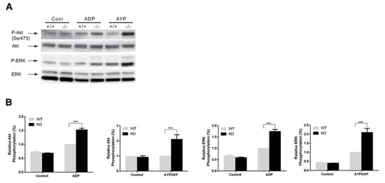 To determine the effect of arrestin3 on GPCR-mediated platelet signaling, we stimulated platelets with 2-MeSADP and AYPGK in WT and arrestin3-deficient platelets and compared the phosphorylation of Akt and ERK as described previously []. The phosphorylation of Akt and ERK mediated by 2-MeSADP and AYPGKF was potentiated more so in arrestin3-deficient platelets than in WT platelets (Figure 5). These findings suggest that arrestin3 plays a role in regulating GPCR-mediated signaling events in platelets.