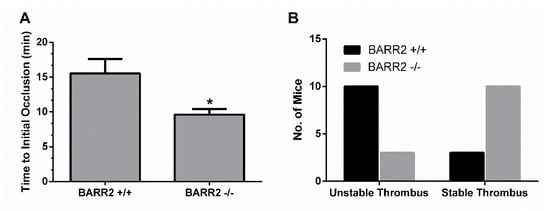 To determine if arrestin3 has a similar platelet function in vivo, we employed an in vivo thrombosis model using FeCl3 injury of the carotid artery [,] and measured the time to occlusion and the stability of the thrombus in WT and arrestin3 −/− mice. Initial thrombosis formation was delayed by 6 min in WT mice compared to arrestin3 −/− mice, which formed a stable thrombus within 9 min after the injury, suggesting that arrestin3 −/− mice have enhanced thrombus formation following vascular injury (Figure 6A). In addition, stable thrombus formation was observed in 77% of arrestin3 −/− mice, while only 33% of WT mice showed stable thrombus formation (Figure 6B), indicating enhanced thrombus stability in arrestin3 −/− mice. These findings indicate that arrestin3 is critical for platelet function in vivo.