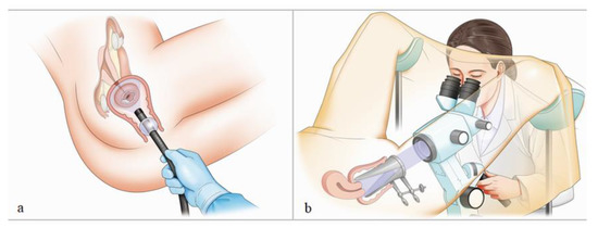 Schematic illustration of patient positioning: ME-NBI (a) and colposcopy (b).