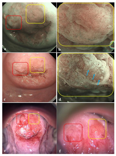 - Uchita, K.; Kobara, H.; Yorita, K.; Shigehisa, Y.; Kuroiwa, C.; Nishiyama, N.; Takahashi, Y.; Kai, Y.; Kunikata, J.; Shimokawa, T.; et al. Quality of assessment of endoscopic forceps biopsy samples under magnifying narrow band imaging for histological diagnosis of cervical intraepithelial neoplasia: A feasibility study. Diagnostics 2021, 11, 360. [Google Scholar] [CrossRef] [PubMed]