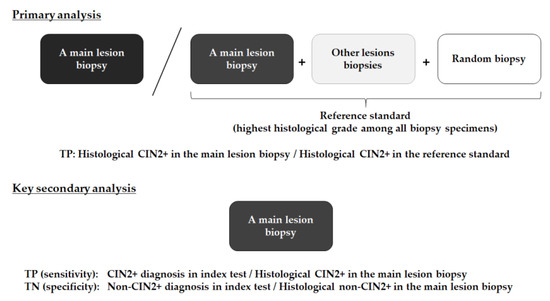 The primary endpoint was the detection ability of ME-NBI for patients with CIN2+ in a main lesion biopsy. This was calculated as the proportion of histological CIN2+ in the main lesion biopsy to histological CIN2+ in the reference standard (highest histological grade among all biopsy specimens) (Figure 4).