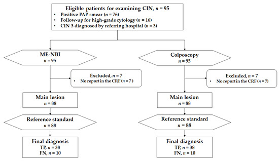 A key secondary endpoint was the diagnostic ability of ME-NBI and colposcopy for histological CIN2+ lesions. Sensitivity was calculated as the proportion of correct diagnoses (CIN2+ diagnosis in the index test) among histological CIN2+ in the main lesion biopsy (Figure 4). Specificity was calculated as the proportion of correct diagnoses (non-CIN2+ diagnosis in the index test) among histological non-CIN2+ in the main lesion biopsy. Other secondary endpoints were the proportion of cases in which the entire circumferential transition zones of the squamocolumnar junction were visible, the proportion of cases in which the external uterine orifice was visible, the incidence of adverse events, and patients’ acceptability.