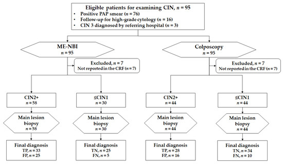 Currently, an image-enhanced endoscopy technology, narrow band imaging (NBI), plays an important role in the diagnosis of gastrointestinal neoplasms [5]. NBI uses narrow band 415 nm and 540 nm wavelength illumination lights, which are well reflected on the mucosal surface and are strongly absorbed by hemoglobin, contrasting surface structures and the mucosal vasculature [6]. Combining magnifying endoscopy with narrow band imaging (ME-NBI) allows clear visualization of the micro-structure and microvessels of the superficial mucosa that correspond to histology. In particular, the effectiveness of ME-NBI for detecting and characterizing esophageal squamous cell carcinoma has been demonstrated in several studies [7,8,9,10]. Therefore, we expected that ME-NBI would also be useful for diagnosing cervical CINs. Although our previous investigation suggested the potential efficacy of this method for diagnosing cervical CINs [11,12], there is minimal evidence to support the usefulness of ME-NBI. The aim of this study was to examine the diagnostic ability of ME-NBI for diagnosing CIN compared with that of colposcopy.