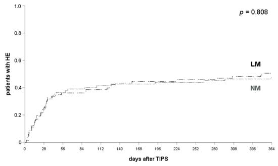 HE occurrence in patients with LM and NM. HE occurred in 38.8% of patients with NM and 33.7% of patients with LM at 1 month (p = 0.581), 44.3% and 40.9% at 3 months (p = 0.723) and 53.7% and 50.6% at 12 months after their TIPS implantation (p = 0.808). log-rank test applied. HE, hepatic encephalopathy; LM, lactulose monoprophylaxis; NM, no prophylactic medication.