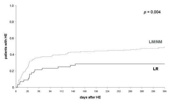 In all patients who received LR (lactulose and rifaximin, n = 59) HE occurred significantly less often compared to patients who received either NM or LM within 12 months (28.1% vs. 52.1%, p = 0.004, log-rank-test; see Figure 2). A significant difference was already observed at one month (36.1% and 15.8%, p = 0.007, log-rank test) and three months after their TIPS implantation (42.6% and 25.0%, p < 0.05, log-rank test).