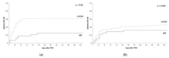 HE occurrence and prophylactic efficacy by history of HE prior to a TIPS implantation. (a) In patients with at least one HE episode prior to their TIPS placement, HE occurred in 44.4% of patients with LM/NM and 10.7% of patients with LR at 1 month (p = 0.009), 61.4% and 20.0% at 3 months (p = 0.003) and 64.7% and 25.0% at 12 months after a TIPS implantation (p = 0.007). A log-rank test ws applied. (b) In patients with no history of HE prior to their TIPS implantation, HE occurred in 34.7% of patients with LM/NM and 20.7% of patients with LR at 1 month (p = 0.173), 39.6% and 29.6% at 3 months (p = 0.364) and 50.7% and 31.0% at 12 months after their TIPS implantation (p = 0.098). log-rank test applied. HE, hepatic encephalopathy; LR, lactulose and rifaximin; LM, lactulose monoprophylaxis; NM, no prophylactic medication.