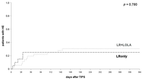 No significant differences were found between patients receiving either LRonly (25% HE post TIPS placement within 12 months) or LR + LOLA within 1, 3 or 12 months (29.7% patients with HE post TIPS placement within 12 months) (p = 0.780, log-rank test, see Figure 4), irrespective of prior HE episodes. The prophylactic efficacy of LR was not significantly affected or improved by additional administration of LOLA (p = 0.780, log-rank test; see supplementary Figure S1a,b).