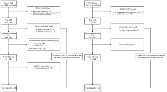 The first study is ESTIMET [18], which is a multicenter randomized controlled trial, including 115 PSPS-T2 patients eligible for SCS and implanted with surgical multicolumn SCS paddle lead, in 12 French centers with a 1-year follow-up. The study details are available at https://clinicaltrials.gov/ct2/show/NCT01628237 (accessed on 12 March 2021). The primary objective of this study was to compare the efficacy of multicolumn SCS programming to the efficacy of monocolumn SCS programming. As part of the ESTIMET study, all subjects provided informed consent and enrolled in the following ethical committee approval (CPP-Ouest III) [18]. The study population consisted of PSPS-T2 patients with refractory pain, eligible to SCS according to the French guidelines for SCS selection and implantation. Per these guidelines, an average of 7-day screening trial period was mandatory for all study patients. Patients with a 50% pain decrease, or patients for whom the improvement was clinically important according to a patient–implanter agreement, were implanted with a permanent SCS device at the end of the trial. Among the ESTIMET study patients, those who did not try transcutaneous electrical nerve stimulation (TENS) were removed from the analysis because TENS efficacy belongs to the set of predictive variables used in the development of the models in this paper (Figure 1). Finally, ninety-one patients who underwent TENS therapy, completed baseline data and completed the study 1-year follow-up were included in the analysis. ESTIMET study data were used for the training and internal validation process of our models.