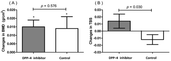 Changes in (A) the BMD and (B) TBS during the follow-up period after the DPP-4 inhibitor treatment. Data are expressed as the mean ± SE. * p < 0.05 by the paired t-test between the values recorded at the baseline and follow-up. p-values were calculated using the Student’s t-test for changes between the two groups.