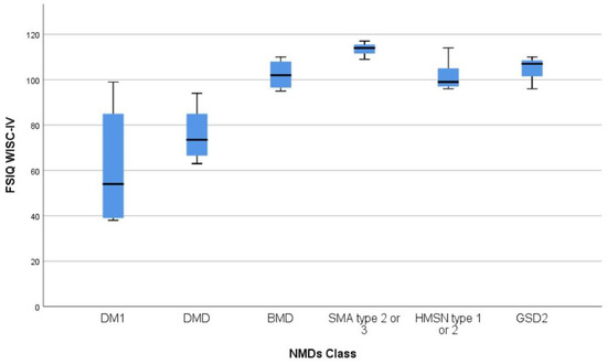 WISC-IV FSIQ boxplots across NMDs cohorts. WISC-IV: Wechsler Intelligence Scale for Children—Fourth Edition; FSIQ: Full Scale IQ; NMDs: Neuromuscular Disorders; DM1: myotonic muscular dystrophy type 1; DMD: Duchenne muscular dystrophy; BMD: Becker muscular dystrophy; SMA: spinal muscular atrophy, type 2 or 3; HMSN: hereditary motor sensory neuropathy, type 1 or 2; GSD2: glycogen storage disease type 2.