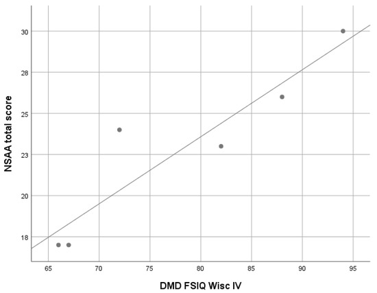 A significant correlation between WISC-IV FSIQ scores and North Star Ambulatory Assessment (NSAA) total scores was found (ρ 0.92; p = 0.008), while no significant correlations were found between the 6-minute walking test (6MWT) total scores and WPPSI-III or WISC-IV FSIQ scores (Figure 2).