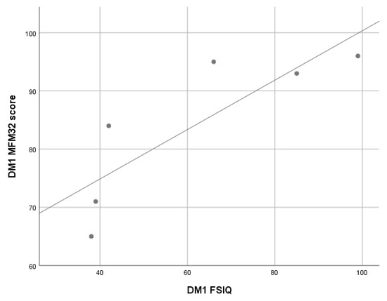 Correlation analysis between WISC-IV FSIQ and total scores on the MFM-32 in myotonic dystrophy type 1 (DM1) cohort. WISC-IV: Wechsler Intelligence Scale for Children, Fourth Edition; FSIQ: Full Scale IQ; MFM32: Motor Function Measure—32 items; Linear R2 = 0.072.