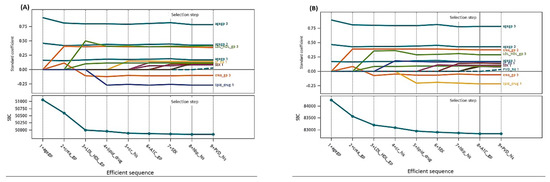 The coefficient progression for time with selection steps for model selection using LASSO method: (A) 7-year and (B) 10-year model.