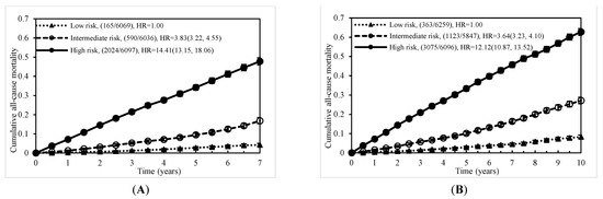 Cumulative mortality due to all causes by risk score level: (A) at 7 years and (B) at 10 years.
